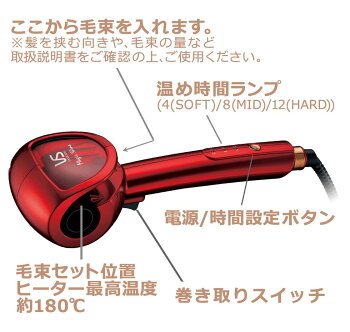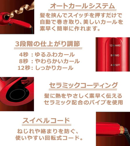 ●最高温度約180℃ ●3段階の温め時間設定(4(SOFT)/8(MID)/12(HARD)秒) しっかりカールから、ゆるふわカールまで仕上がり調整 温め秒数により、仕上がりのカールの大きさを調節 ●セラミックコーティングパイプ ●自動電源OFF機能 もしもの切り忘れ時にも安心! 自動的に(約60分後)に電源がOFFになります。